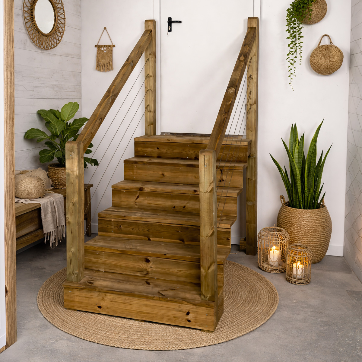 Manufactured from pressure-treated wood, the TOKYO staircase is highly resistant to rain, humidity, and insects, guaranteeing long-lasting durability and structural stability in outdoor environments.
