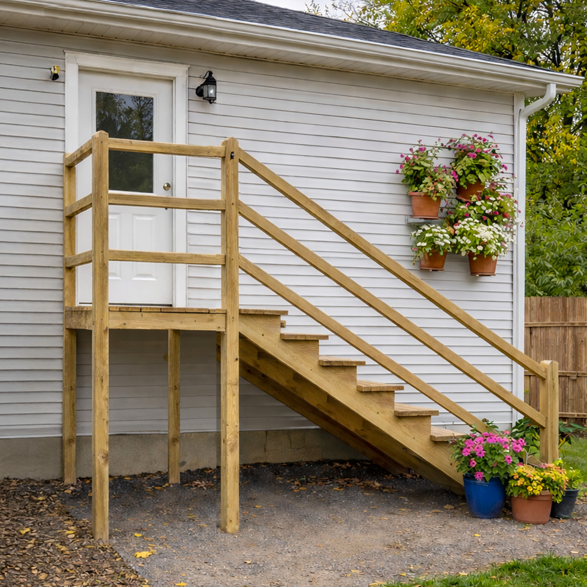 MILANO Outdoor Wooden Staircase with Handrail and Landing – Rounded Post Finish, 3–7 Steps