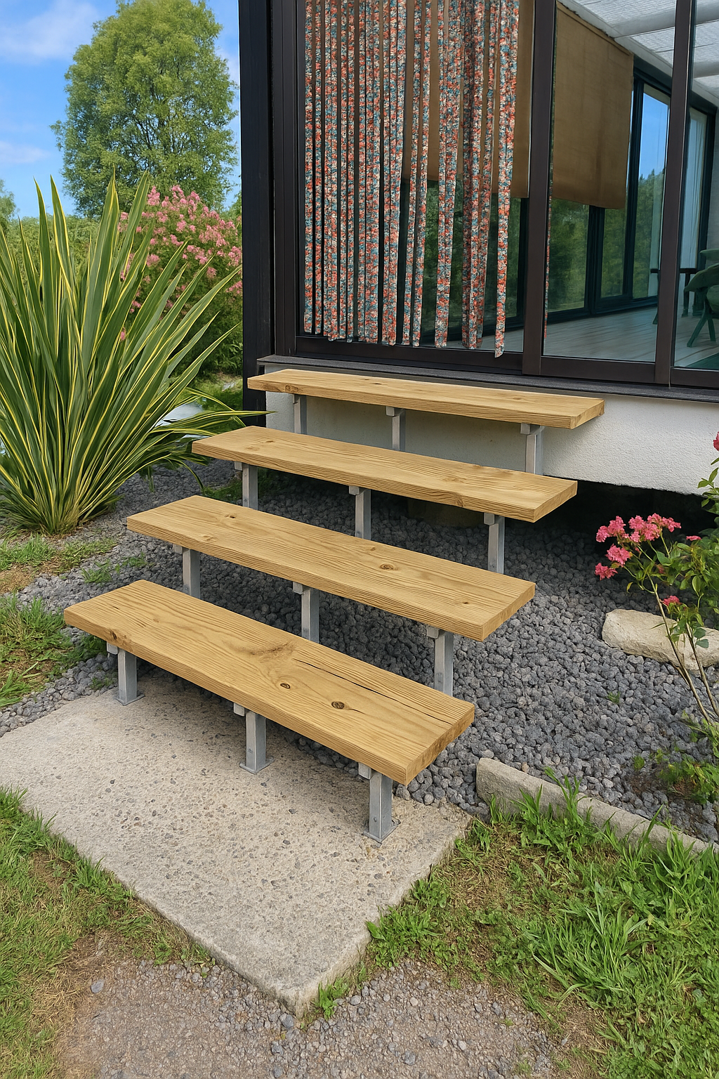 Le possibilità di questi gradini sono infinite. Combinando diverse larghezze e lunghezze, si può costruire una scala da esterno.